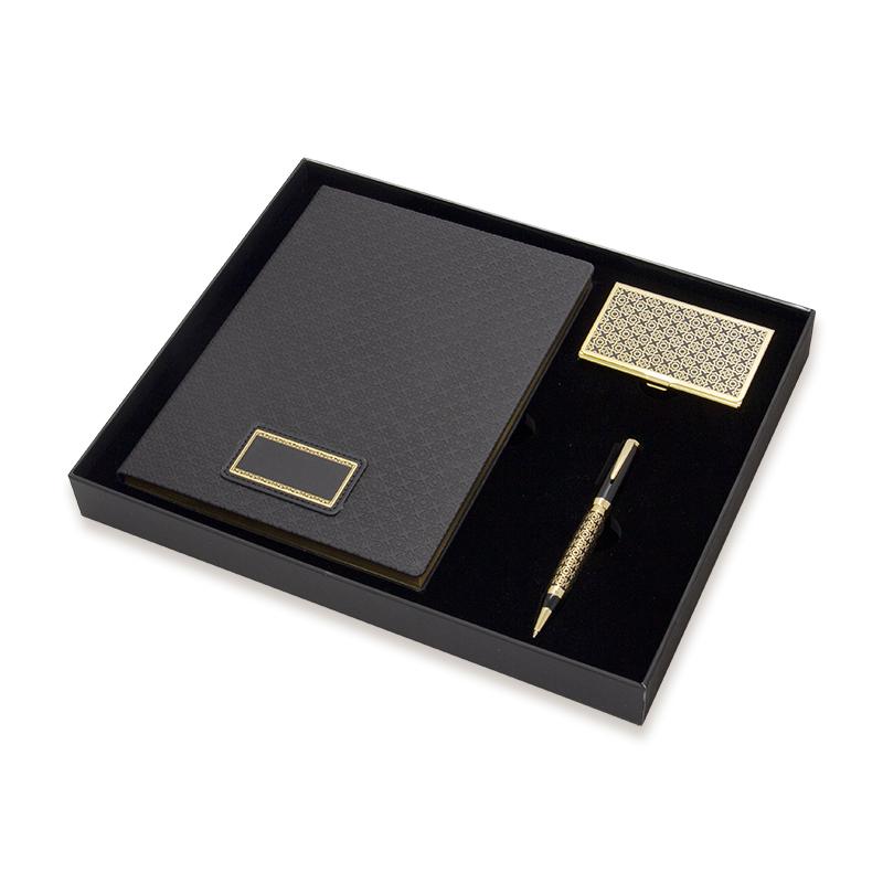 МатериалРучка: металл, покрытие золотого цвета, цветная эмаль. Визитница: металл, покрытие золотого цвета, цветная эмаль. Записная книжка: обложка из экокожи с тисненым орнаментальным узором.